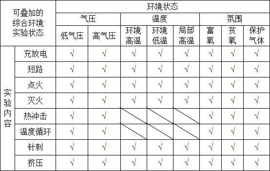 4)氣壓、溫度、氛圍三組環境狀態,可單獨與實驗內容疊加,比如短路+環境低溫;也可多環境狀態復合疊加,比如針刺+高氣壓+環境高溫+富氧;