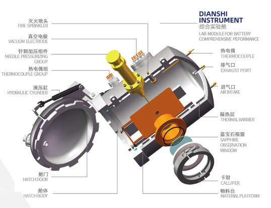 點石儀器綜合實驗艙可實現多種環境要素(溫度、壓力、氣氛等)耦合,對電池進行多類測試(針刺、擠壓、過充、過放、短路、溫度循環、點火、滅火),用于電芯及小型電池模組的綜合性能測試。