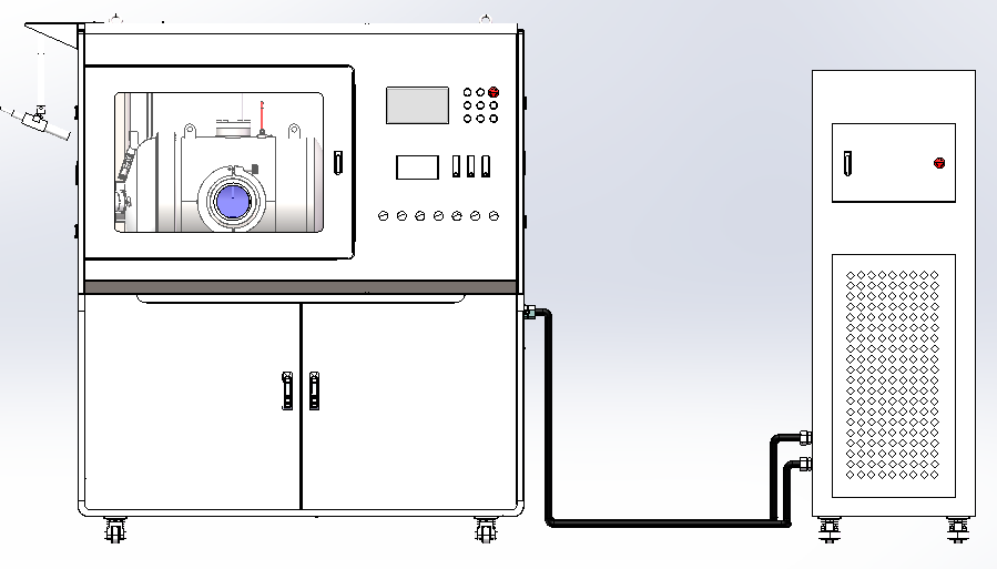整個設備占地面積約11.5㎡(包括操作空間),主要包括實驗艙和制冷制熱機組兩大部件。產品結構示意圖如下:
