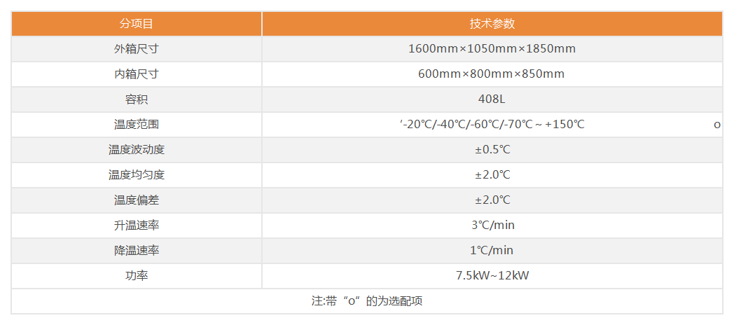 ●低溫環境:最低環境溫度:-70℃,降溫速率:1℃/min;冷卻方式:氣冷或水冷;制冷劑:非氟環保R404A/R23;依據標準:GB/T 2423.1-2008、GJB/T 150.4-86