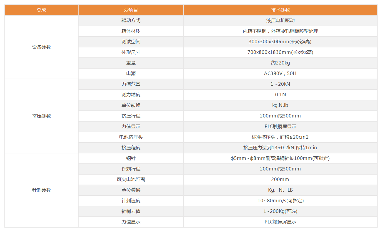 適用于模擬各類電池在使用、運輸、儲存過程中,電池遭受擠壓和穿刺的情形。