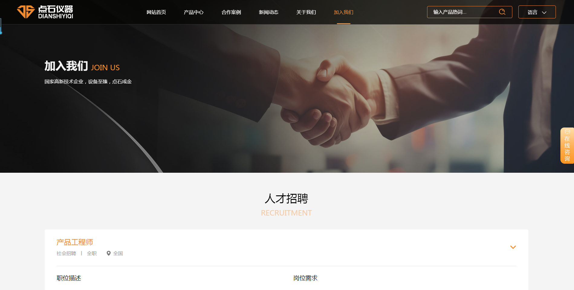 新增人才招聘、經銷商加盟、在線咨詢便于了解職位需求、銷售渠道資源等信息為有相關需求的用戶提供更加及時的指引中英文網頁自如切換,構建全球化視野。