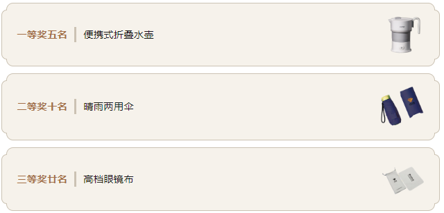 一等獎五名,獎品為便攜式折疊水壺;二等獎十名,獎品為晴雨兩用傘;三等獎廿名,獎品為高檔眼鏡布。