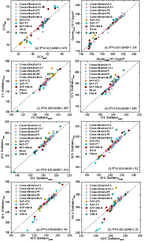 (2)基于航油組分信息,對實際航油的14個關鍵屬性進行實時預測和評估基于小樣本學習框架所得到的映射關系,能實現基于航油化合物族分布和碳數分布信息,對實際航油的關鍵屬性進行實時預測。將該框架應用在傳統航油(Jet A、 Jet A-1、JP 5、JP 8等)、SAF(ATJ、FT、HEFA、SPK等)、兩者摻混燃料以及其他替代航油,其結果如圖2所示。從圖2可知,十六烷值(DCN)、密度、20%餾出溫度、50%餾出溫度和燃燒熱值的R2均大于0.9,除-20℃粘度(R2= 0.843)和-40℃粘度(R2= 0.80),其他性能的R2均>0.85,且預測精度都在各自的ASTM容差范圍內。另外,本研究提出的框架與現有框架相比,預測精度實現數量級提升、普適性更高、涵蓋的航油物性類別更全面,而且首次實現完全滿足ASTM的評估誤差。基于該框架,能實現在盲目擴大SAF生產前,小體積、低成本、高效率地對候選SAF產品綜合性能進行評估與初篩,從而極大地降低SAF的研發風險。