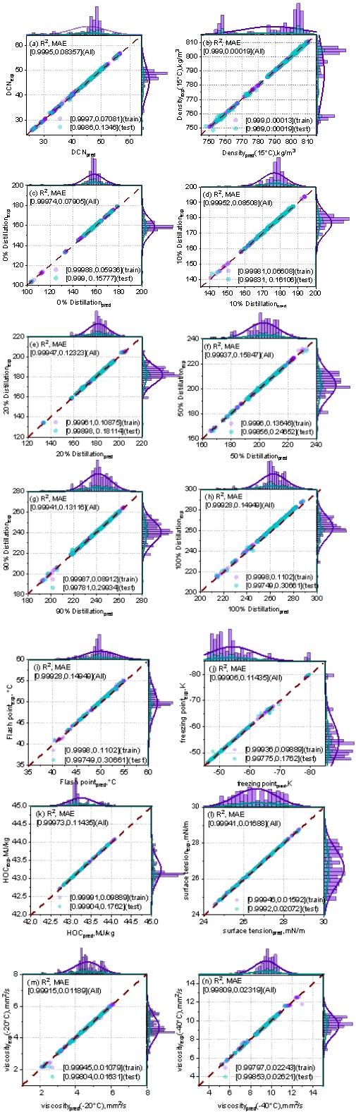 (1)基于多模態半監督回歸模型和數據生成的小樣本學習框架航油的理化和燃燒特性主要受其組成分布所主導。因此,有潛力通過航油的組分信息來實現快速且可靠地甄別潛在SAF。然而,盡管目前航油的生產使用非常廣泛,但針對不同生產地點、批次的航油組分信息非常局限。為了解決數據量不足的問題,本研究開發了基于多模態半監督回歸模型和數據生成的小樣本學習框架,能實現基于小數據樣本,可靠地構建從航油組分信息到目標參數的映射關系。本研究目標參數選擇航油的14個關鍵理化屬性進行映射關系構建,分別為:密度、十六烷值、6種蒸餾溫度(0%、10%、20%、50%、90%、100%)、閃點、冰點、燃燒熱值、表面張力、-20℃和-40℃下的粘度。這14個屬性涵蓋了燃料的基本理化性能,直接影響燃料在高空低溫、極端溫度變化及高速燃燒等特定條件下的表現。這14個屬性也是ASTM D7566和D4054標準中定義的關鍵指標,用于確保SAF能夠達到與傳統航空燃料相同的性能標準。圖1為所開發的小樣本學習框架在生成數據集上對14個關鍵屬性的預測結果。采用R-squared (R2)和Mean Absolute Error (MAE)作為模型評價指標。從圖1可知,所有屬性在訓練集、測試集、以及總數據集的R2均大于0.99,表示模型對數據的擬合能力非常強,MAE均小于0.31,表示模型的預測具有極高的準確度。