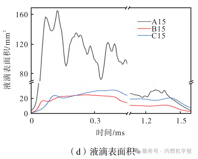 (3) HFO 的黏度增加使 IT 推遲、燃燒相位提前,但著火后放熱率變緩、峰值下降、火焰與噴嘴間的距離縮短;IDS 內等體積的液滴束表面積差異較大,低黏度 HFO 液滴表面積波動,液滴穩定性差。