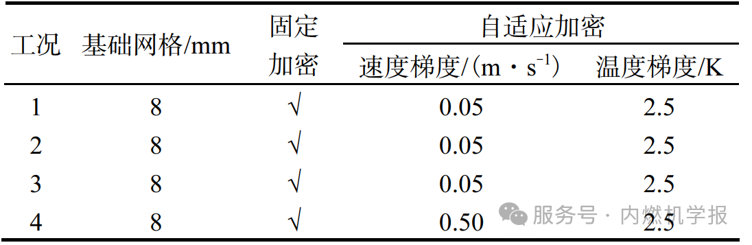 筆者建立 CVCC 模型,并使用 Converge 在 4 種工況下進行模型驗證。基礎網格尺寸為 8 mm,表 2 為網格設定與加密策略,進行網格加密后最小網格尺寸為 0.062 5 mm。對噴孔附近進行 7 級固定加密,且根據速度和溫度梯度施行 7 級自適應加密。圖 1 為 CVCC 的幾何模型尺寸及加密效果。使用 163 種組分和 887 個反應的詳細化學反應機理結合 SAGE 化學動力學求解器描述燃料氧化、著火和燃燒過程中的化學反應。采用 KH-RT 描述燃料的破碎過程,其中模型常數 B0 和 B1 分別取值為 0.61 和 50。大渦模擬(LES)和雷諾平均(RANS)都可以對噴霧過程中的湍流運動進行較為精確地描述,但在高噴射壓力條件下,LES 具有更好的瞬態精確度,因而筆者使用 LES 求解噴霧和燃燒過程中涉及的湍流運動。分別采用液體燃料質量分數為 90% 和氣態燃料質量分數為 0.1% 作為計算 LPL 和 VPL 的閾值。研究中 LPL 使用 ECN 的推薦值,而 VPL 則根據密度梯度進行測算。對密度求導后得到密度梯度的切片,經圖像處理與識別得到密度梯度圖像邊緣與噴嘴的最大垂直距離。使用密度梯度統計 VPL 的優勢在于其與紋影技術原理更為接近。同時,可以避免因燃燒導致仿真計算中以質量分數閾值統計 VPL 產生的波動與錯誤。將燃燒化學發光強度最大值的一半所對應的時刻定義為 IT。以 OH* 的化學熒光表示火焰的位置,火焰與噴嘴間的最短距離定義為 FLOL。