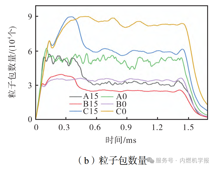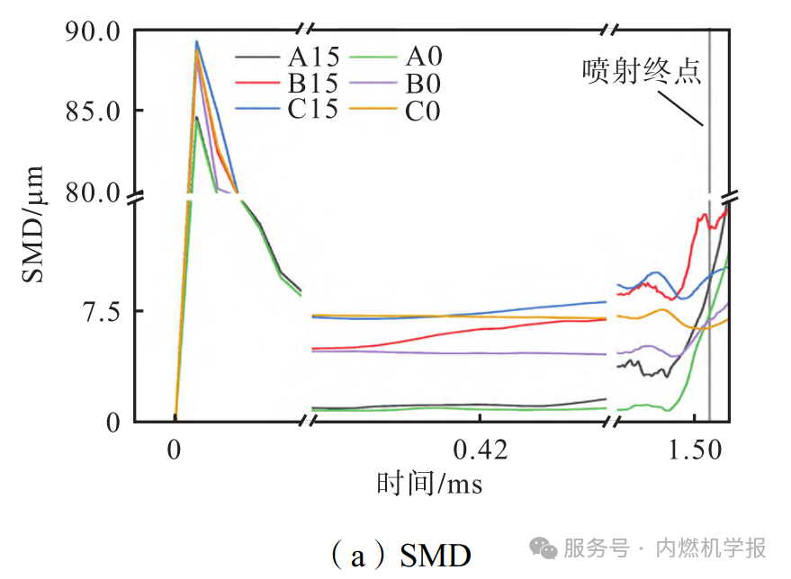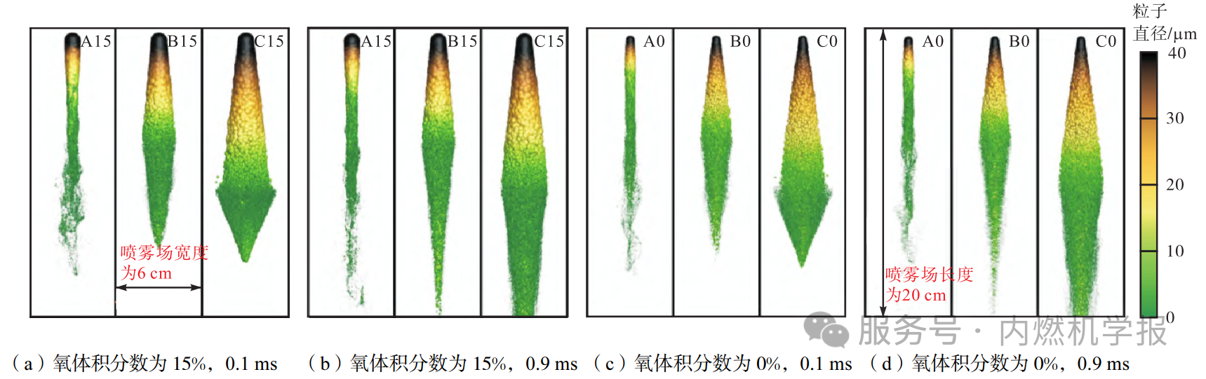 (2) SMD 和液滴直徑分布受著火與燃燒作用的影響截然相反;液滴表面積的下降速率大于液相體積的下降速率,導致含氧條件 SMD 略有增加。