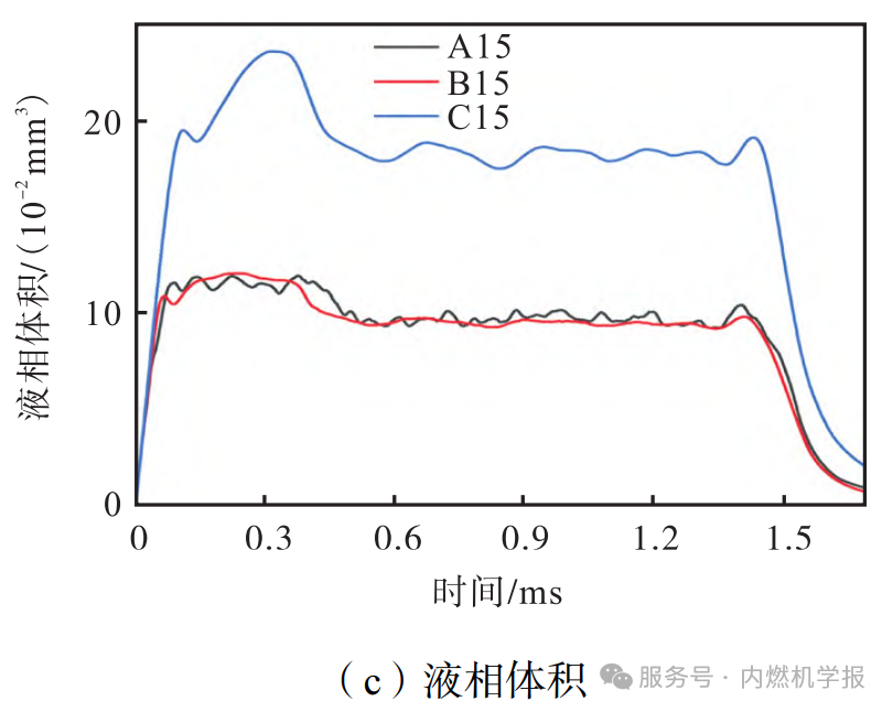 高黏度燃料的液滴穩定性增加、破碎難度增加,破碎后的液滴直徑增加、霧化質量變差。SMD 是評價霧化質量的重要指標,能體現燃料的破碎與蒸發特性。SMD 越小說明霧化程度越好。圖 7 為不同燃料的液相噴霧參數。圖 7(a)中,SMD 的變化與黏度呈正比,且最大差異超過 85%。噴霧初期,SMD 與是否發生氧化反應無關,著火前 SMD 有輕微的上升趨勢,噴射結束后 SMD 顯著上升。為了極大程度地降低計算時間、節約計算資源,Converge 在求解噴霧的過程中引入了粒子包(parcel)的概念。粒子包是由一系列半徑、速度和溫度等相同的燃料液滴組成,因而粒子包的數量與噴霧場中液滴直徑的種類相同,如噴霧場中有 x 個粒子包,就會有 x 種液滴直徑。圖 7(b)為燃料黏度對粒子包數量的影響。根據粒子包與粒子直徑的對應關系,可知,液滴直徑種類與 HFO 的黏度無關,但直徑種類都因燃燒而降低。同時,液滴表面積的下降速度大于液相體積的下降速度,使 SMD 上升,因而粒徑種類降低說明氧化與燃燒促進大直徑液滴的破碎與小直徑液滴的蒸發。液相體積與表面積變化趨勢說明在著火前低黏度對液滴破碎有利。燃料 B 和燃料 C 的液滴表面積和 SMD 接近,但液相體積相差較大,而二者的粒徑種類相差超過 70% ,因而可以推斷燃料 C 噴霧的大直徑液滴占比更多。同時,更大的液滴表面積強化了液滴與環境的相互作用,蒸發與卷吸效果增強。燃料黏度、霧化和蒸發等過程都會影響液滴直徑的分布規律。圖 8 為 0.1 ms 和 0.9 ms 時刻噴霧場內的液滴分布和液相形態。液相噴霧在徑向的擴散能力與黏度呈正比。黏度增加,液滴的分布形態變得中部寬而頭尾窄,液相噴霧的最大寬度增加。液滴分布也反映出黏度越低,大直徑液滴占比越低,液相噴霧前端的分散度越好。著火與燃燒加速了小直徑液滴蒸發,SMD 減小,噴霧體積降低,證明了燃料 C 的液相噴霧中大直徑液滴占比更多的推斷。