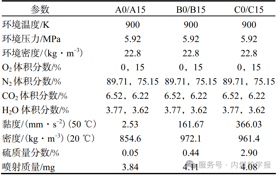 按照是否發生燃燒將噴霧分成無氧條件下非反應噴霧及含氧條件下的反應噴霧。筆者使用的燃料性質、CVCC 內的初始條件及噴射條件見表 3。研究中使用 3 種硫質量分數、密度和黏度極具代表性的 HFO。燃料的黏度和密度隨硫質量分數波動,其中密度最大差異為 12.1%,黏度相差 144 倍。按照黏度(硫質量分數)升序對 HFO 從燃料A~C編號。