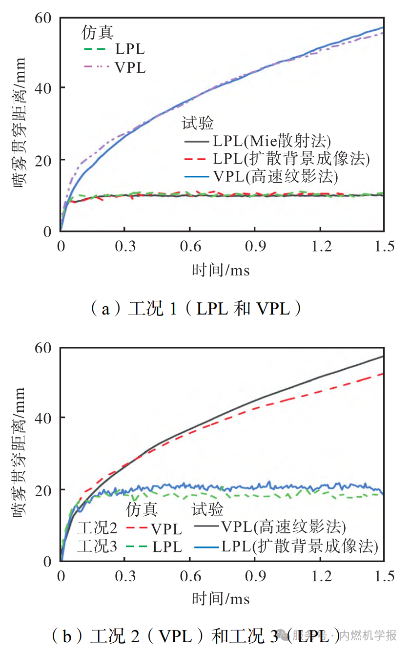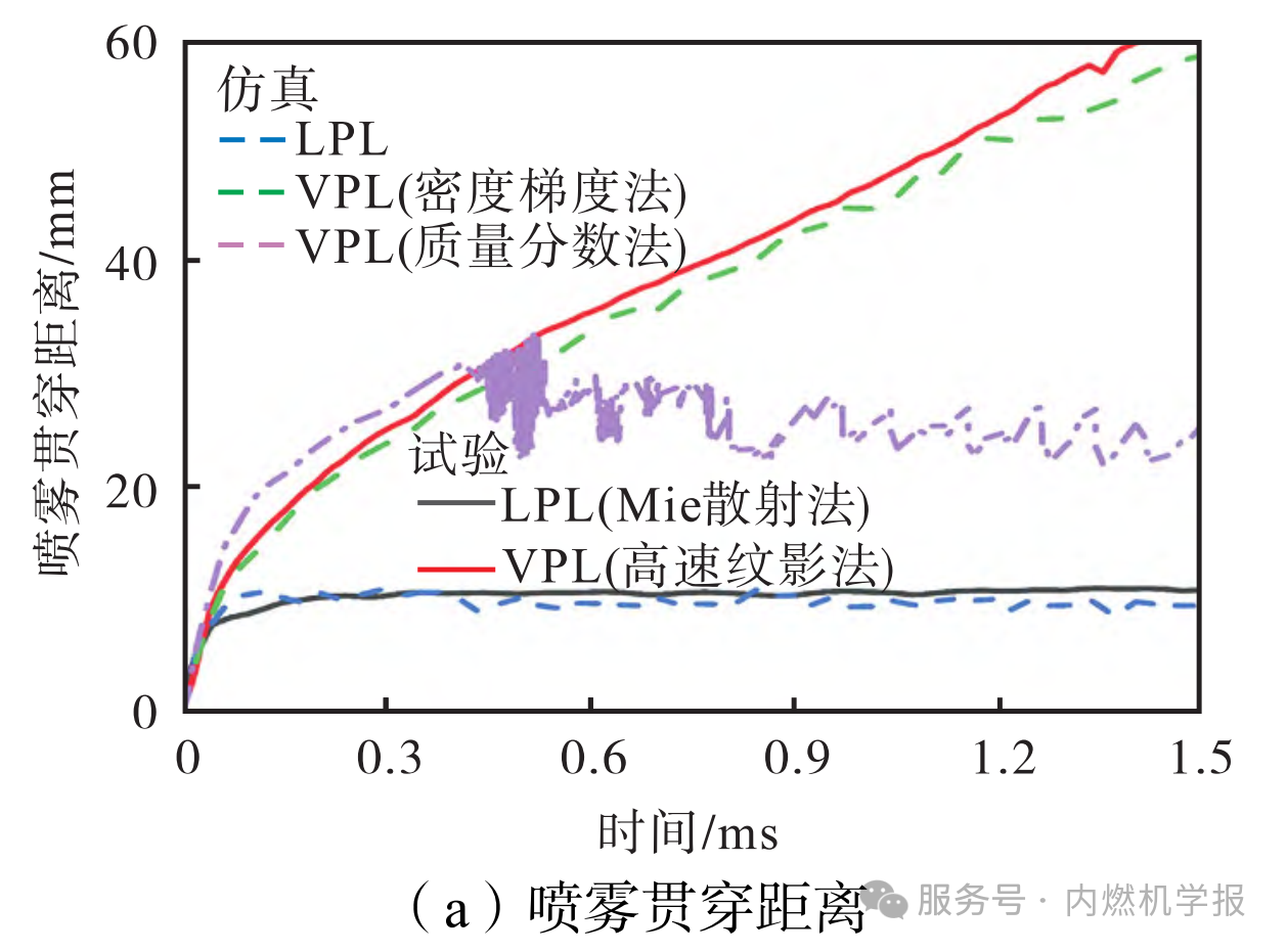 VPL 和 LPL 分別是對應閾值與噴孔的最大垂向距離,表征了燃料射流的穿透能力。試驗中使用高速紋影法、擴散背景成像法和 Mie 散射法獲得噴霧的 VPL 和 LPL,仿真中使用質量分數法和密度梯度法獲得 VPL 和 LPL。圖 2 為工況 1、2 和 3 下 CVCC 模型的驗證。該模型能較好地描述非反應條件下燃料的噴射和霧化過程。