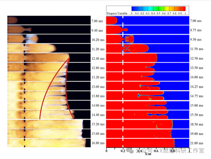 圖3 BR = 0.5時,實驗和大渦模擬火焰演化結構的比較
