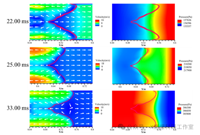 圖7 當BR = 0.5時,火焰通過障礙物時的速度場和壓力場