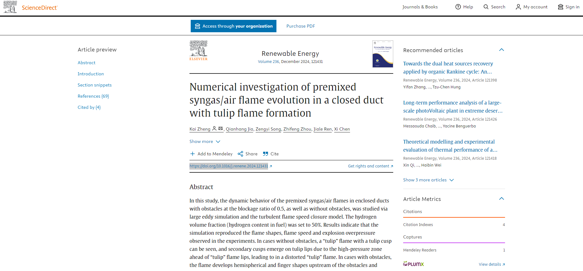 化石燃料能源燃燒產生的排放物對環境造成嚴重損害。合成氣作為一種重要的清潔替代能源,受到了廣泛關注。合成氣主要由CO和H2組成,熱值高,污染小,可以通過多種方法生產。然而,在合成氣生產、運輸和使用的每個階段都可能出現安全問題。在實際情況中,合成氣/空氣爆燃火焰在傳播期間可能遇到障礙物。根據先前眾多研究,火焰通過障礙物后,會出現一種新的“郁金香”火焰。但是,由于現有實驗數據和方法的局限性,這一現象背后的根本原因尚未揭示。本研究旨在探索新觀察到的“郁金香”火焰發展模式的根本原因,可以為合成氣安全提供重要的科學指導,并為其他清潔能源的安全提供科學的方法指導。