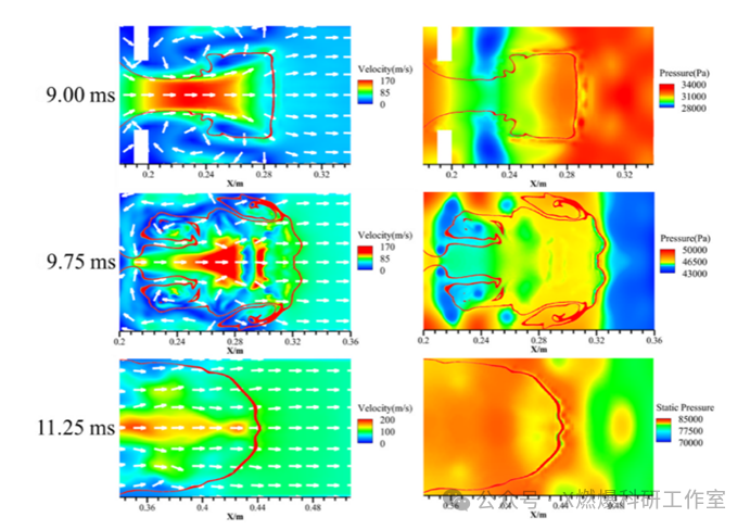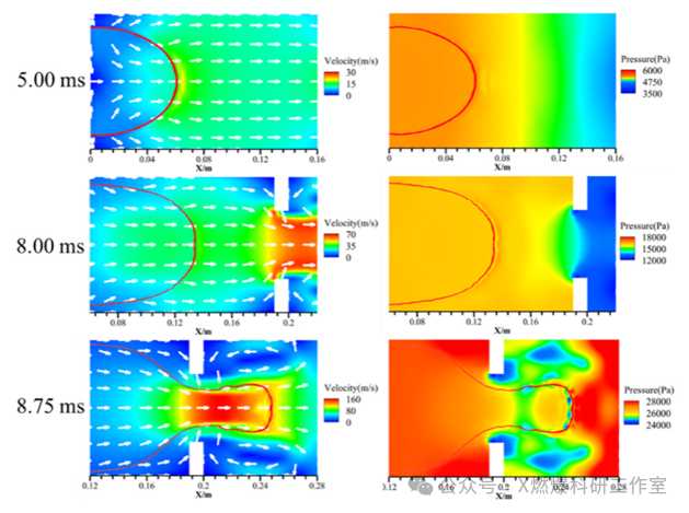 圖6-7顯示了當BR = 0.5時,火焰接近和通過障礙物時,火焰前沿附近的速度場和壓力場。與BR = 0時類似,點火后壓力梯度為正(t = 5.00-8.00 ms,如圖6所示)。之后,火焰從障礙物噴出,導致火焰速度和過壓的快速激增(在t = 8.00-8.50 ms)。此時,障礙物下游出現一對壓力稀疏區域,并伴隨著渦流的形成(圖6中t = 8.75 ms)。在通過障礙物時,火焰裙被卷入渦流中。火焰呈現蘑菇狀結構,伴隨著火焰速度的降低。隨后,障礙物下游的殘余混合物被消耗,并且燃燒產物的膨脹推動火焰以更高的速度向右傳播。