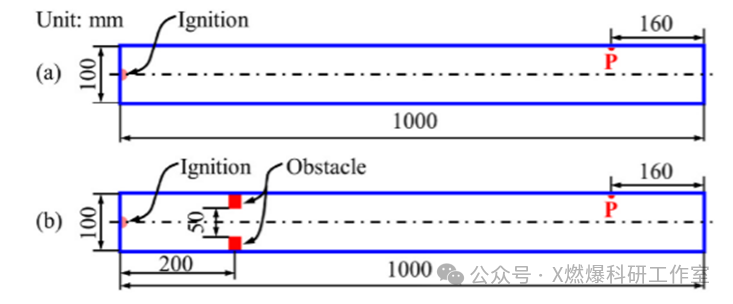 如圖1所示,模型尺寸為100 mm × 100 mm × 1000 mm。在距離左端200 mm的上下壁布置了兩個阻塞比(BR)為0.5的障礙物。點火點在左端中心半徑為5 mm的半球形區域內。在管道的上壁上,設置了一個監測點P,用于壓力收集。模擬的初始條件設定為大約0.1 MPa壓力和300 K溫度。