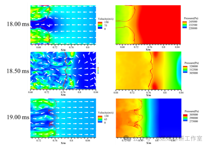 圖8說明了從“郁金香”火焰到雙“郁金香”火焰整個發展過程中速度場和壓力場的變化。如圖8中t = 18.00 ms處所示,壓力梯度和流場主要為負,而火焰唇之間的流場為正。因此,火焰唇的移動向左移動,而尖點向右移動,導致火焰唇彼此更靠近。最后,上火焰唇和下火焰唇幾乎合并在一起,如圖8中t = 18.50 ms處所示。在這一點上,流場是正向的,在所有的區域,除了在側壁附近的燃燒氣體中的渦流。燃燒區內的速度場分布不均勻。之后,隨著壓力梯度的變化,出現了雙“郁金香”火焰(圖8中t = 19.00 ms)。