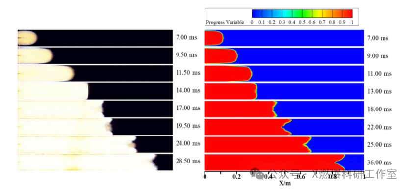 (1)在沒有障礙物的情況下,火焰經歷了“郁金香”火焰的經典演變,并可以發展成扭曲的郁金香形狀。然而,在具有障礙物的情況下,障礙物下游的火焰在顯示出郁金香形狀之后可演變成更復雜的形狀。
